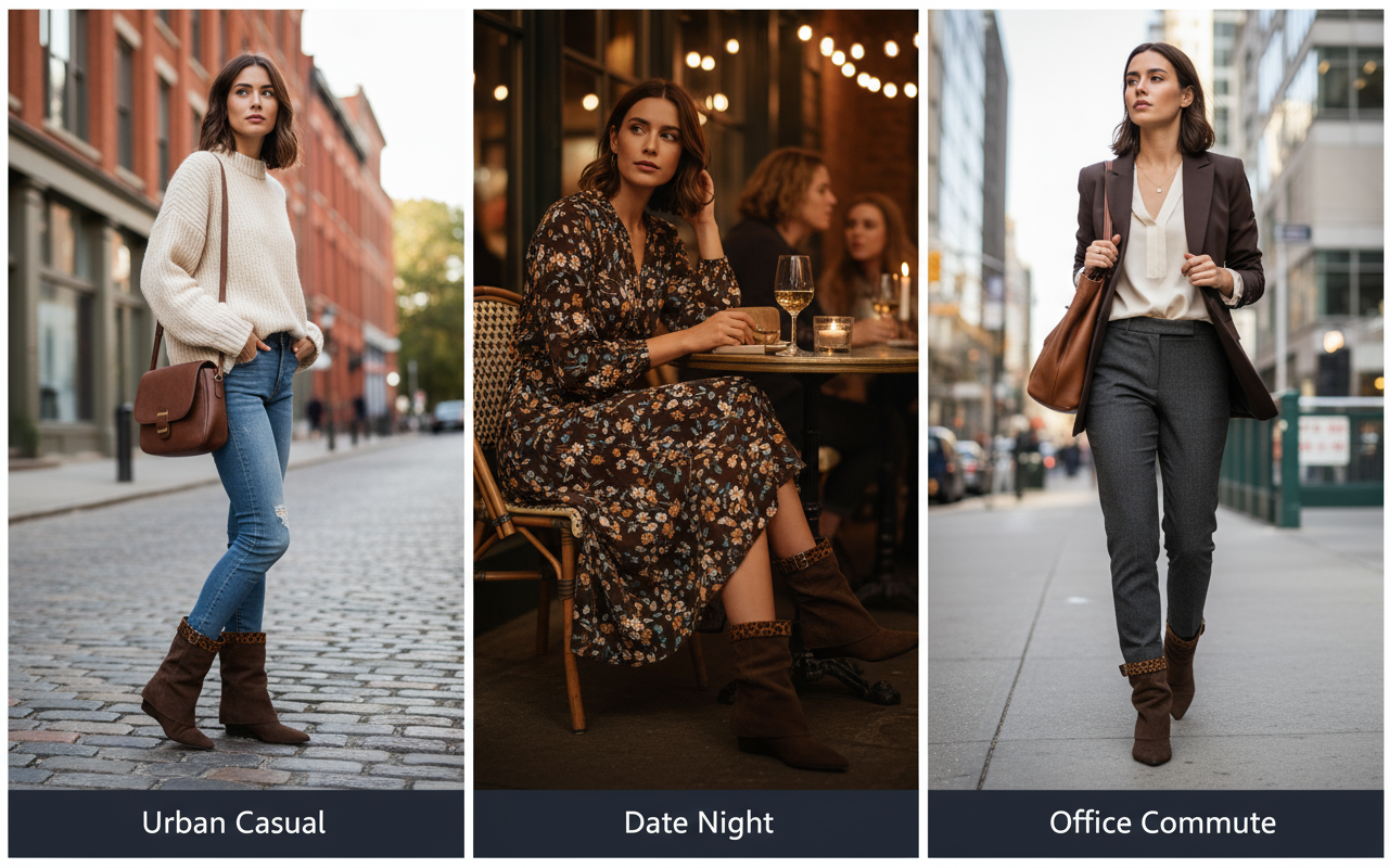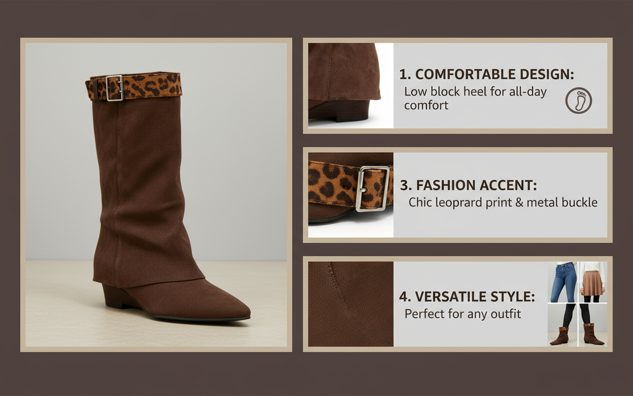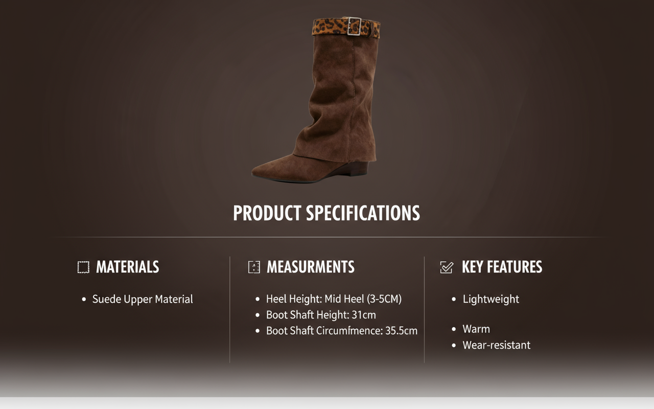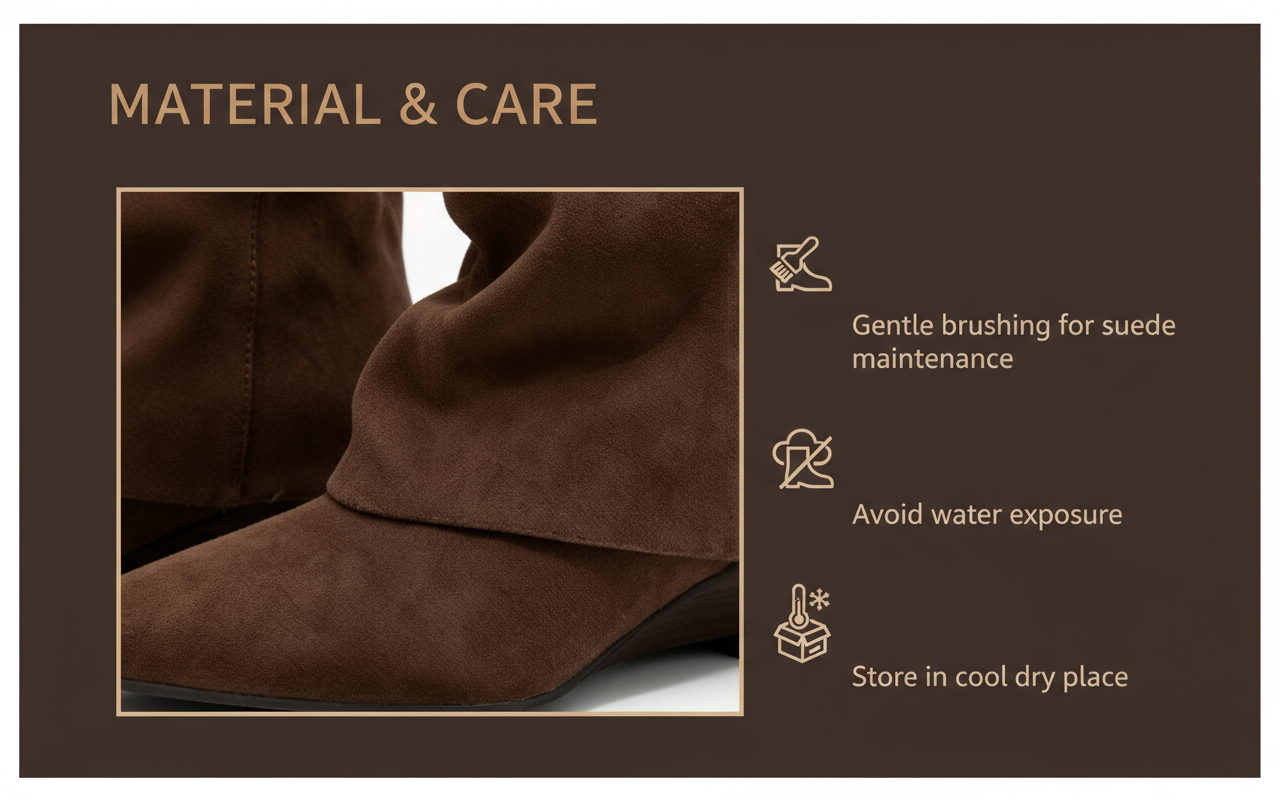 Design‌: Brown color + soft material (suede/velvet), tall silhouette refines legs, suits daily/outings.